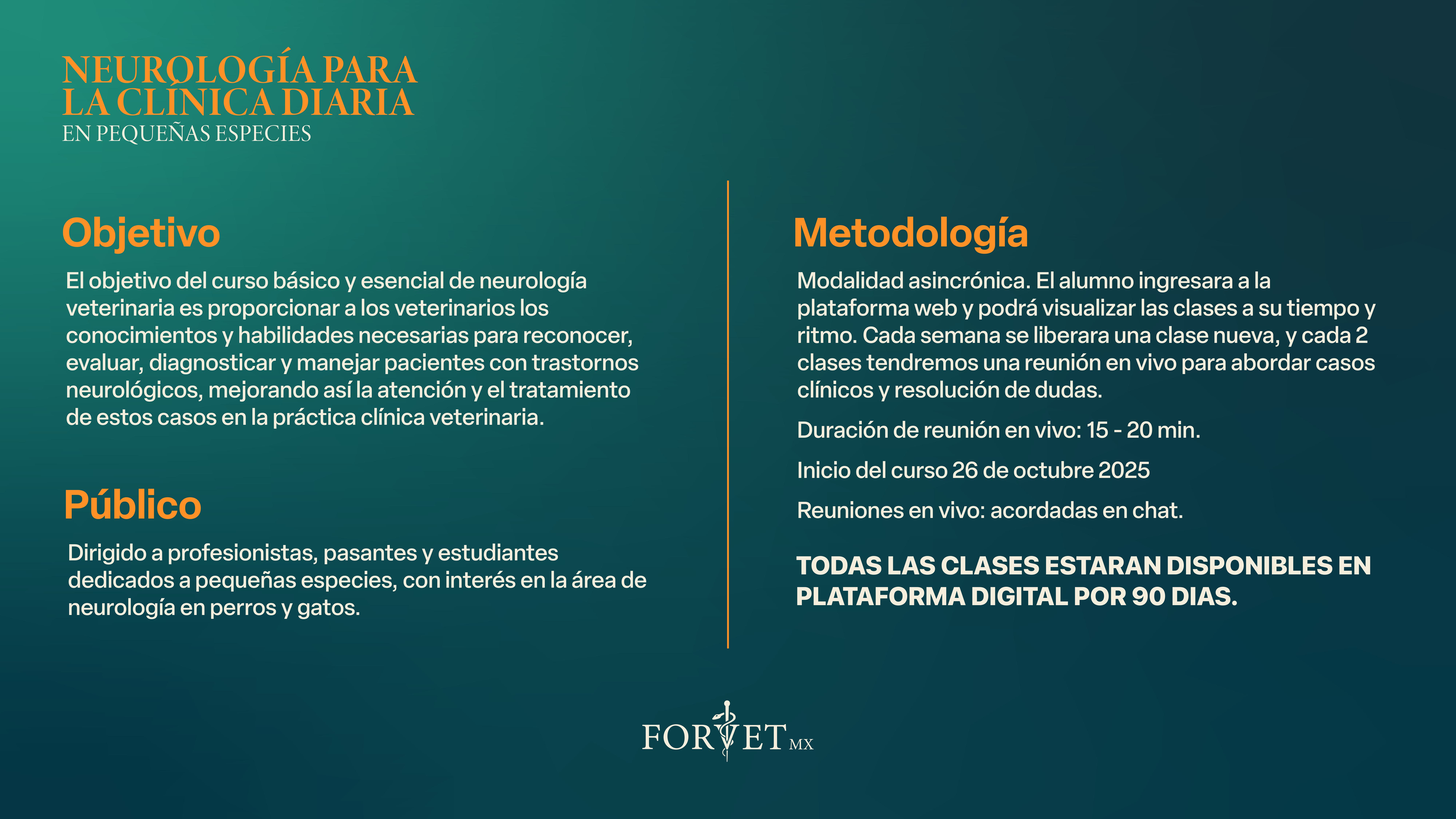Dirigido a profesionistas, pasantes y estudiantes dedicados a pequeñas especies, con interes en el area de neurología.